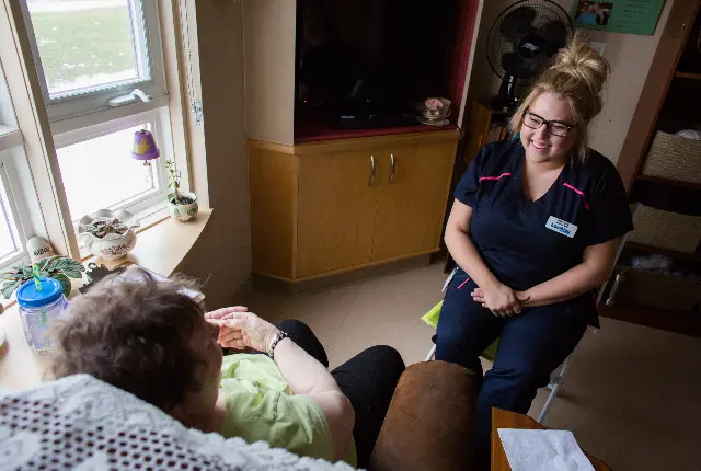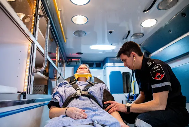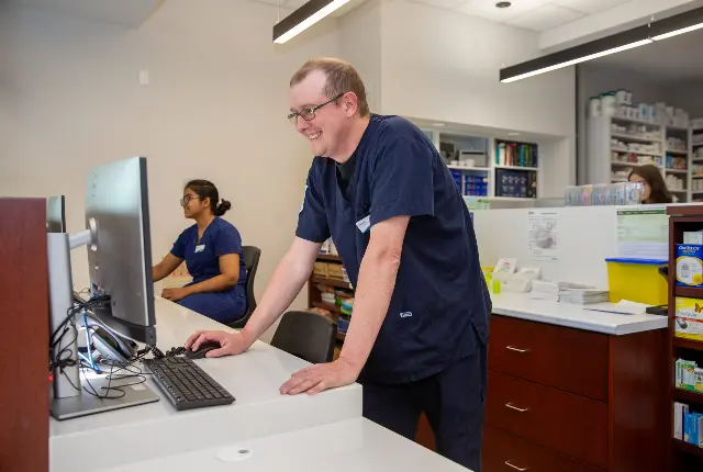 Student checking pulse in Nursing Lab